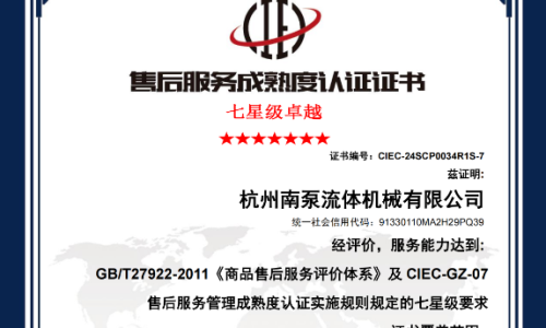 杭州南泵售后獲得《商品售后服務達標認證五星級證書》《售后服務體系管理成熟度認證七星級(卓越)證書》等各類服務認證